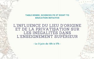Right To Education Initiative et la Clinique de Droits Humains de Sciences Po organisent une table ronde en ligne sur les inégalités dans l’enseignement supérieur français, jeudi 3 juin 2021 de 15h à 17h. Conçu comme un espace d’échange entre les différentes parties prenantes de l’éducation, la rencontre réunira des chercheur-es, étudiant-es et organisations de la société civile pour une discussion sur l’influence du lieu d’origine, du coût de la vie étudiante, et de la privatisation de l’enseignement supérieur dans la réalisation du droit à l’éducation.