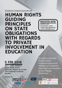 Together with the Missions of Finland, France, and Portugal, NORRAG, the Geneva Academy of International Humanitarian Law and Human  Rights, Amnesty International, the Equal Education Law Centre, the Global Initiative for Economic, Social and Cultural Rights, the Initiative for Economic and Social Rights, and the Right to Education Initiative, we invite you to join a consultation on Human rights guiding principles on state obligations with regards to private involvement in education, which will take place on Monday 5th February, 2018. The event will be held at the Maison de la Paix, Salle S8, The Graduate Institute, Geneva.