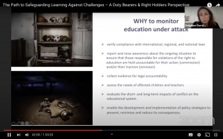 Delphine Dorsi presented information about monitoring education under attack from a human rights perspective, in addition to introducing RTE's work on this area and the two guides we published on this day to assist journalists and civil society organisations monitor attacks on education.