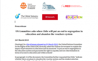 (Santiago) In a list of issues released on 5th March 2015, the United Nations Committee on the Rights of the Child (CRC) formally asked the Chilean Government to explain the impact of privatization in education and its measures “to put an end to segregation in the education system and guarantee the right to equality and non-discrimination in terms of access to education and within schools”.