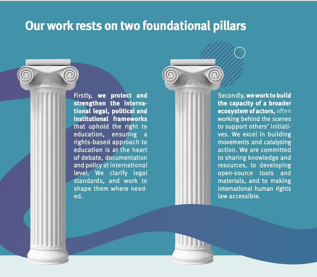 We are the guardians of the right to education. For more than two decades, we have been working to promote education as a human right, and ensure that it is both recognised and fully understood as such by all national and international laws and policy makers, and properly taken into account in decision-making processes so that all efforts – political, legal and financial – are made to progressively realise the right to education for all people. Much of what we do is in support of others, occurring behind the scenes and in service of a long-term and collaborative view.